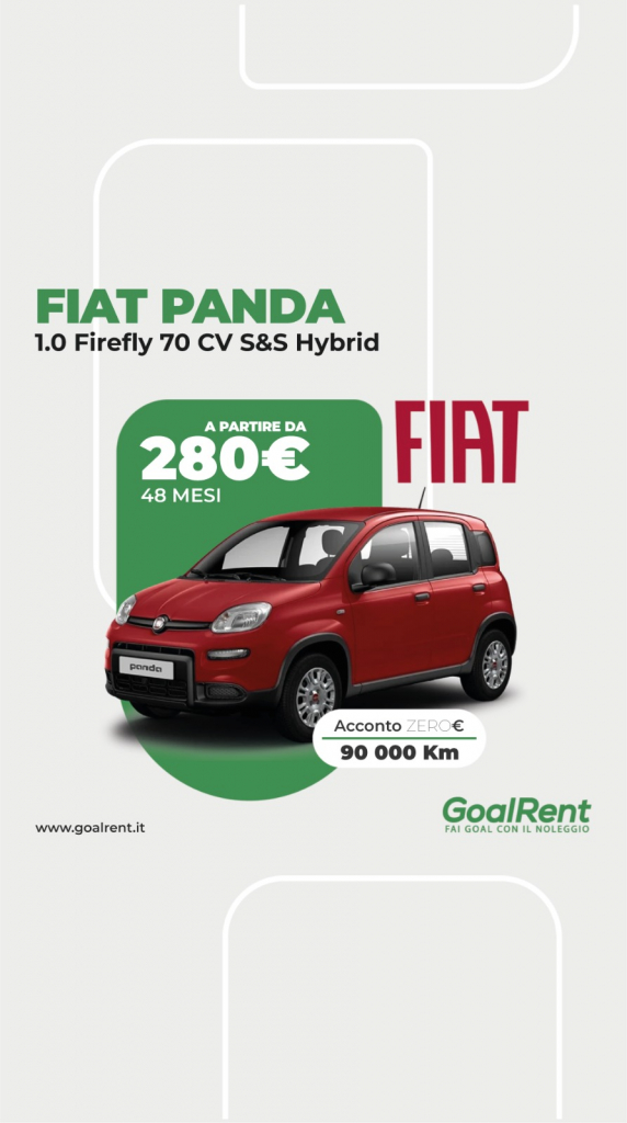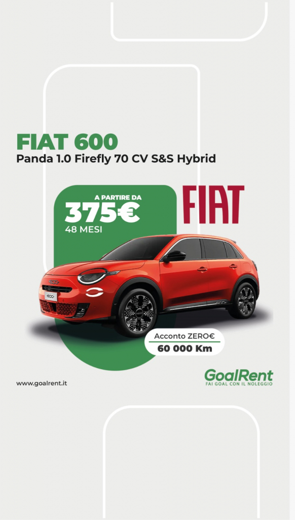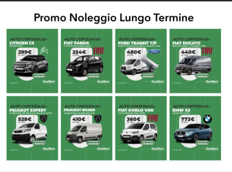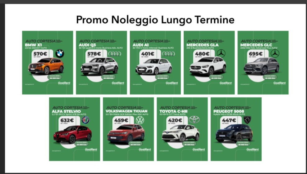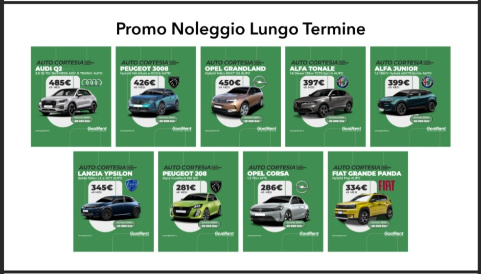 Quando ti affidi a GoalRent non resti mai a mani vuote, o meglio, con la stessa auto! Qualsiasi sia il tuo desiderio in fatto di auto, scooter e furgoni, noi lo esaudiamo con proposte dei migliori marchi e di ogni tipo di alimentazione (ibride, elettriche, diesel, benzina).